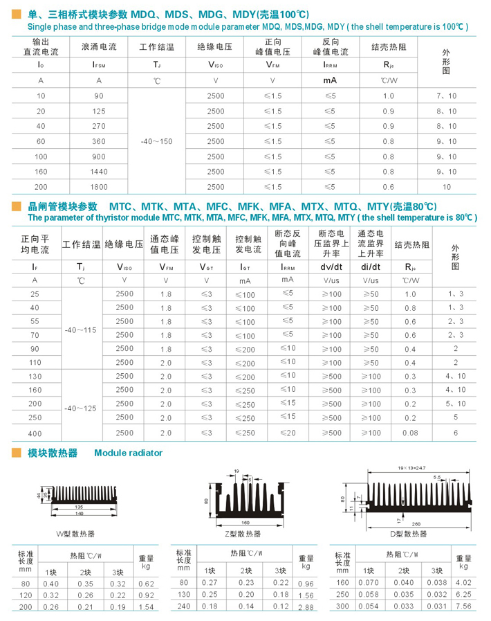 单、三相桥式模块参数MDQ、MDS、MDG、MDY(壳温100℃)